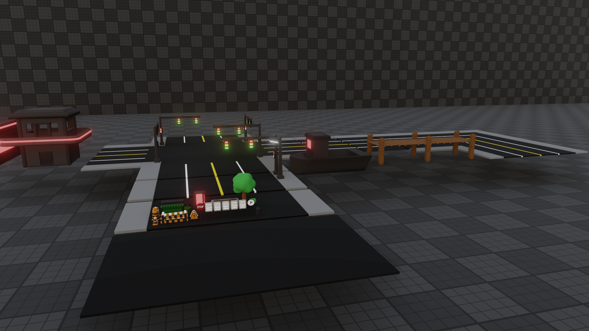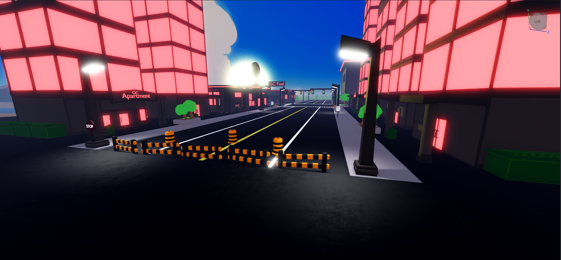 Multiple Signs, Fences, Cones, Traffic Lights, Street Lights